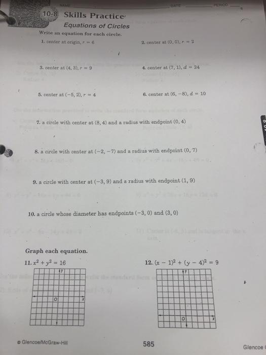 Equations of circles worksheet. Equations For A Circle Worksheets & Teaching Resources | TpT Equation of a Circle Notes and Worksheet Bundle. by. Acute Geometry Class. 1. $4.50. $3.60. Bundle. Zip. This set of worksheets includes notes and practice on circle equations including center-radius form, using midpoint and distance formulas, graphing, and completing the square. Circles Worksheets Each pdf worksheet has 12 problems on finding the radius or diameter of the circle in decimals. Divide the diameter by 2 and multiply the radius by 2 to complete the exercise. Coloring, Tracing, and Drawing Circles Drawing a circle freehand is definitely a tricky task for kids. DOC Worksheet on Equations of Circles - Weebly That process would involve completing the square of the binominals for ( x - h ) and ( y - k ) . Consider the general equation of the circle defined by x2 + y2 - 14x - 18y + 105 = 0. First, group the terms by variable in brackets: [ x2- 14x ] + [ y2 - 18y ] + 105 = 0. PDF Precalculus H/GT Worksheet: Conics Circles - NBISD Worksheet: Conics - Circles Write an equation in standard form of each circle described below: 1. End points of a diameter are (3, 2) and (5, -4). 2. r 5, Center (-3, 5) 3. ... Find the equation of the circle having center on the line xy 5 and tangent to the x-axis at the point (8, 0). 15. Find the equation of the line that is tangent to ...
