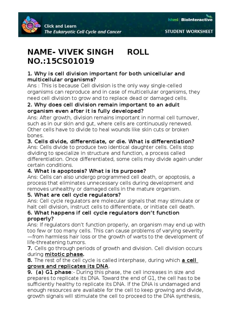 Copy of The Eukaryotic Cell Cycle and Cancer Worksheet BIOLA102 F2020 ... View Copy of The Eukaryotic Cell Cycle and Cancer Worksheet BIOLA102 F2020.pdf from ECON MISC at University of Alaska, Anchorage. This document is made available by the Howard Hughes Medical. ... PROCEDURE Follow the instructions as you proceed through the Click & Learn and answer the questions in the spaces below.