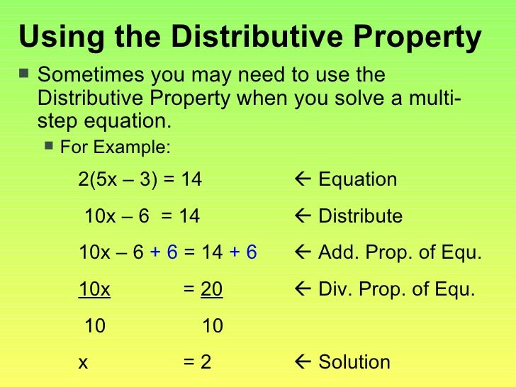 Solving Equations Using The Distributive Property (3) The distributive property allows us to remove the parentheses by ... {There are two ... algebraic equations or to simplify some algebraic expressions.