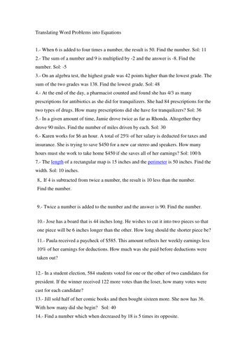 Linear word problems worksheet. writing linear equations word problems - TeachersPayTeachers Slope Cards, Handouts or ReviewThis worksheet helps students find slope problems from tables, graphs or word problems and allows the students to see all parts of writing linear equations.Includes:-Word Problems (slope)-Graphing Linear Equations-Table (slope)Can be used for: classroom assignments, homework, center material, prep material and ... Worksheet on Word Problems on Linear Equation | Linear Equations ... Linear Equations Problems with Solutions 1. Convert the following statements into equations? (a) 5 added to a number is 9. (b) 3 subtracted from a number is equal to 12. (c) 5 times a number decreased by 2 is 4. (d) 2 times the sum of the numbers K and 7 is 13. Solution: 2. A number is 12 more than the other. Find the numbers if their sum is 48? Word Problems for Linear equations - Physicscatalyst Word Problems for Linear equations. Question 1. P and Q each have certain number of apples. A says to B, "if you give me 10 of your apples, I will have twice the number of apples left with you". B replies, "if you give me 10 of your apples, I will the same number of apples as left with you.". Find the number of apples with P andQ ... PDF Linear Equations - Word Problems - Langevin Grade 9 Linear Equations - Word Problems Word problems can be tricky. Often it takes a bit of practice to convert the english sentence into a mathematical sentence. This is what we will focus on here with some basic number problems, geometry problems, and parts problems. A few important phrases are described below that can give us clues for how to set