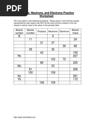 50 Protons Neutrons And Electrons Worksheet Chessmuseum Template ... Protons, neutrons, and electrons practice worksheet fill in the blanks in the following worksheet. please keep in mind that the isotope represented by each space may not be the most common isotope or the one closest in atomic mass to the value on the periodic table. atomic symbol atomic number protons neutrons electrons atomic mass b6 11 24 31.