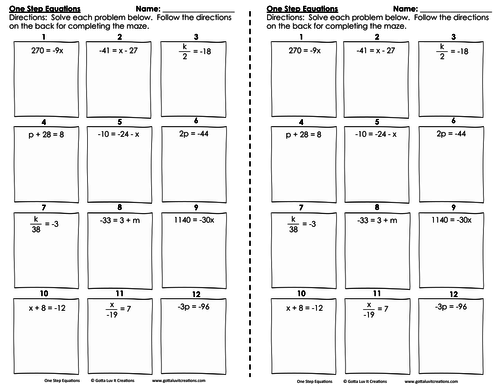 Search Printable One-Step Equation Worksheets - Education Browse Printable One-Step Equation Worksheets. Award winning educational materials designed to help kids succeed. ... Solving One-Step Equations Maze. Practice solving one-step addition, subtraction, multiplication, and division equations as you make your way through this fun maze! ... Kids will have a good time following the game format in ... Free math worksheets - Homeschool Math Other math worksheet websites. DadsWorksheets.com - thousands of free math worksheets This site has over 5,000 different math worksheets from kindergarten to pre-algebra and growing. Math Maze Generate a maze that practices any of the four operations. You can choose the difficulty level and size of maze. 10 Quickies Worksheets