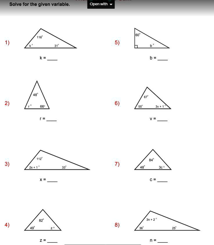 Worksheet triangle sum and exterior angle theorem find the value of x 4.1 Worksheet Triangle Sum and Exterior Angle Theorem Answer Key NO WORK, NO CREDIT! 1. 75 2. 63 3. 20 4. 55 5. 23 6. 17 7. 85 8. 30 9. ... unity 2022 urp evo new braunfels. Worksheet triangle sum and exterior angle theorem find the value of x. star citizen 600i rework 2022 morbius milo dancing scene song lyrics.