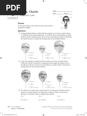Charles' Law Worksheet ANSWER KEY.pdf - Google Docs You may be offline or with limited connectivity. ... Download Charles Law Practice Worksheet Answer Key - myilibrary.org Charles' Law Worksheet ANSWER KEY 1) The temperature inside my refrigerator is about 40Celsius. If I place a balloon in my fridge that initially has a temperature of 220 C and a volume of 0.5 liters, what will be the volume of the balloon when it is fully cooled by my refrigerator? 0.47 L 2) A man heats a balloon in the oven. Charles' Law Worksheet - SharpSchool Charles' Law Worksheet ANSWER KEY 1) The temperature inside my refrigerator is about 40 Celsius. If I place a balloon in my fridge that initially has a temperature of 220 C and a volume of 0.5 liters, what will be the volume of the balloon when it is fully cooled by my refrigerator? 0.47 L 2) A man heats a balloon in the oven. Charles' Law Problems At night it only holds 19 liters. What is the temperature at night? Give the answer in Kelvin and °C? 4) A 113L sample of Helium at 27° ...