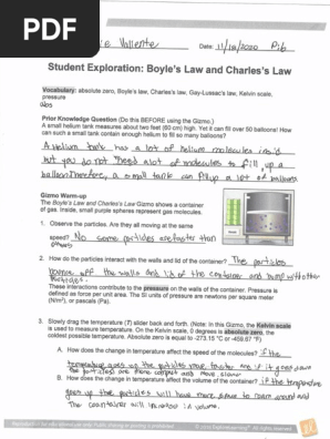 Use Boyles' Law to answer the following questions Boyles' Law. Use Boyles' Law to answer the following questions: 1). 1.00 L of a gas at standard temperature and pressure is ... Charles' Law Worksheet. Charles' Law Worksheet Charles' Law Worksheet ANSWER KEY. 1). The temperature inside my refrigerator is about 40 Celsius. If I place a balloon in my fridge that initially has a ... PDF Charles' Law Worksheet - tumwater.k12.wa.us Charles' Law Worksheet ANSWER KEY 1) The temperature inside my refrigerator is about 40 Celsius. If I place a balloon in my fridge that initially has a temperature of 220 C and a volume of 0.5 liters, what will be the volume of the balloon when it is fully cooled by my refrigerator? 0.47 L 2) A man heats a balloon in the oven.