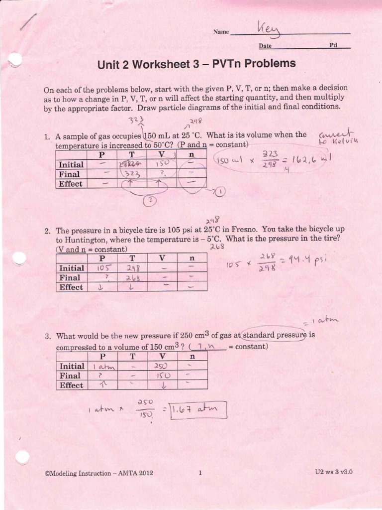 Date Pd Unit 2 Worksheet 3 – PVTn Problems - vdocuments.site Jul 2, 2018 ... Modeling Instruction – AMTA 2014 1 U2 ws 3 v3.1 Name Date Pd Unit 2 Worksheet 3 – PVTn Problems On each of the problems below, ...