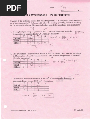 U2 WS 3 PVnT problems with key (2).doc - Chemistry Unit 2... Chemistry NameUnit 2 Worksheet 3 PVnT Problems Date________Per ______ On each of the problems below, start with the given P, V, T, or n; then make a decisionas to how a change in P, V, T, or n will affect the starting quantity, and then multiplyby the appropriate factor. Draw particle diagrams of the initial and final conditions. 1. Unit_3_worksheet_3_-_answers.pdf - Name Date Pd Unit 3,... (P and n = constant) 2. The pressure in a bicycle tire is 105 psi at 25˚C here in Fresno. You take the bicycle up to Huntington, where the temperature is-5˚C. What is the pressure in the tire? (V and n =constant) 3. What would be the new pressure if 250 cm3of gas at standard pressure is compressed to a volume of 150 cm3? PDF Unit 2 - Cover page - American Modeling Teachers Association 10. Solving PVTn problems, ws 3 11. Whiteboard ws 3, Unit 2 review 12. Unit 2 test Overview Observing how students describe matter and its changes, it became evident that beginning chemistry students do not have, and often do not fully develop, a consistent mental model of matter as discrete particles. Read Book Chemistry Unit 2 Pvtn Problems Answers Worksheet 3 - PVTn Problems On each of the problems below, start with the given P, V, T, or n; then make a decision as to how a change in P, V, T, or n will affect the starting quantity, and then multiply by the appropriate factor. Draw particle diagrams of the initial and final 2 2 Chemistry Unit 2 Pvtn Problems Answers 5-10-2022