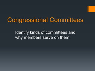 › committeesCommittees of the U.S. Congress Committees of the U.S. Congress. Profile pages for committees active in the current congress are listed here. Committee Name History includes information about terminated committees and commissions authorized to interact with the Congress.gov data sets. The Committee Consideration tutorial explains committees within the context of the legislative process.