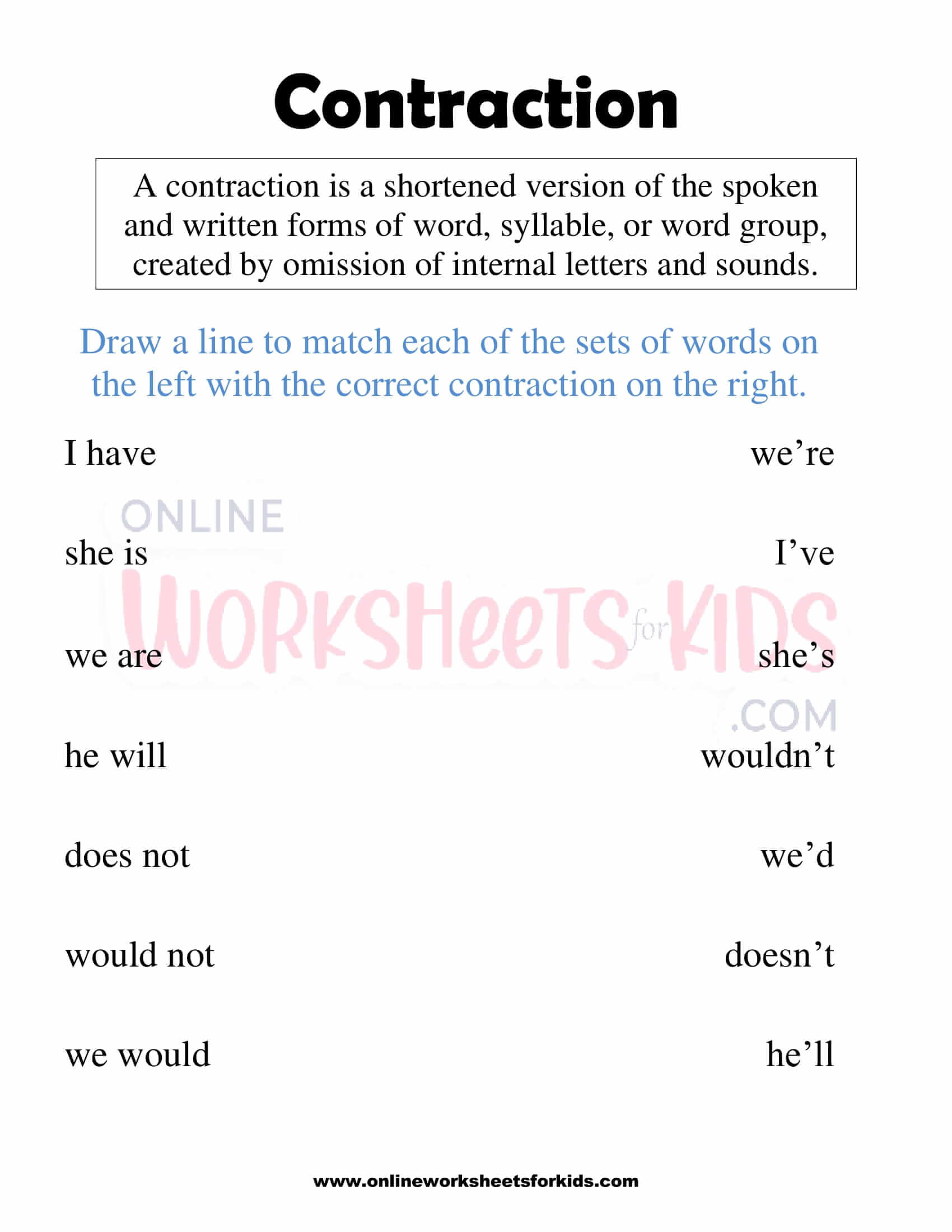 Browse Printable Contraction Worksheets | Education.com 2nd grade. Reading & Writing. Worksheet. Crystal Clear Contractions. Worksheet. ... Through a variety of engaging exercises, our contractions worksheets help kids grasp that contractions represent a combination of two words. As students begin to master contractions, they may need practice with differentiating them from possessive nouns. ...