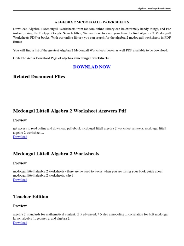 Mcdougal littell algebra 1 worksheet answers. softmath.com › math-com-calculator › inverseExtraneous solution calculator - softmath glencoe algebra 1 textbook answers ; prentice-hall algebra 2 study guide ; symbols of algebra II ; McDougal Littell Algebra 2 book ch. 14 worksheets ; negative exponent in algebrator ; exponents roots ; algebraic thinking function table worksheets ; difference quotient formula made easy ; Google users found our website today by using these ... McDougal Littell Algebra 1 Practice Workbook - Quizlet Find step-by-step solutions and answers to McDougal Littell Algebra 1 Practice Workbook - 9780618736942, as well as thousands of textbooks so you can move ... McDougal Littell Algebra 1, Arizona Edition - 1st Edition - Quizlet Find step-by-step solutions and answers to McDougal Littell Algebra 1, Arizona Edition - 9780618887743, as well as thousands of textbooks so you can move ... algebra1-practiceworkbook-mcdougal.pdf The workbook covers essential skills and vocabulary. Space is provided for students to show their work. McDougal Littell. A HOUGHTON MIFFLIN COMPANY.