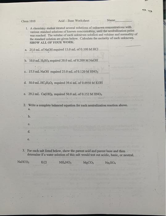 Acid base neutralization reaction worksheet. Chemistry Quizzes | Study.com Interested in seeing how well you know a particular chemistry concept? Take Study.com's brief multiple-choice quiz. Obtain rapid feedback and results to understand how well you performed. The quiz ... Chemistry 12 Unit 1 Reaction Kinetics Unit 2 Equilibrium Unit 3 -Solubility Unit 4 - Acids, Bases and Salts Unit 5 - Redox Review & Exams TRY OUT ONLINE TUTORING FOR FREE! dcolgur@gmail.com Or phone 250-494-9065 e-mail: dcolgur@gmail.com CLICK HERE FOR TESTIMONIALS AND MORE INFORMATION ABOUT TUTORING. ALSO, SEE MY CHEM 11, and SCIENCE 10 … 25 Examples of neutralization reaction - DewWool 01/06/2021 · The reaction of strong acids with strong bases having a divalent cation. 6. Hydrochloric acid(HCl) and magnesium hydroxide(Mg(OH) 2), both strong acid and base react to yield water(H2O) and MgCl 2.Magnesium hydroxide is a strong base generally used as an antacid to neutralize the acids in the stomach (which contains hydrochloric acid). Assignment Essays - Best Custom Writing Services Get 24⁄7 customer support help when you place a homework help service order with us. We will guide you on how to place your essay help, proofreading and editing your draft – fixing the grammar, spelling, or formatting of your paper easily and cheaply.