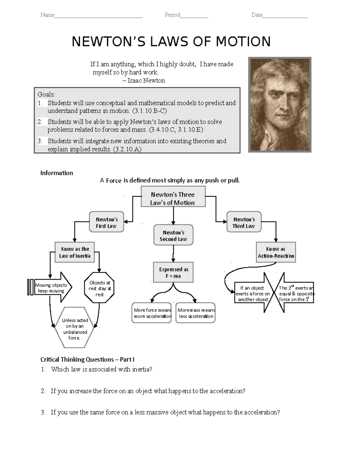 Isaac newton's 3 laws of motion worksheet. Physics Quizzes | Study.com Curious to see how well you have mastered a certain physics concept? Take Study.com's quick multiple-choice quiz. Obtain immediate results to ascertain how well you did. The quiz's partner lesson ... study.com › learn › physics-quizzesPhysics Quizzes | Study.com Isaac Newton's Life: Quiz & Worksheet for Kids . View Quiz. Series Circuit Facts for Kids . ... Newton's 3 Laws of Motion Facts for Kids . View Quiz. Scientific Method Process Facts for Kids . Light - Wikipedia Although the motion of the Crookes radiometer was originally attributed ... Isaac Newton studied Gassendi's work at an early age and preferred his view to Descartes's theory of the plenum. He stated in his Hypothesis of Light of 1675 that light was composed of corpuscles (particles of matter) which were emitted in all directions from a source. One of Newton's arguments against … Newton's Laws of Motion - Homeschooling Exercises - ThoughtCo 17/01/2019 · Sir Isaac Newton, born on January 4, 1643, was a scientist, mathematician, and astronomer.Newton is regarded as one of the greatest scientists who ever lived. Isaac Newton defined the laws of gravity, introduced an entirely new branch of mathematics (calculus), and developed Newton's laws of motion.. The three laws of motion were first put together in a …