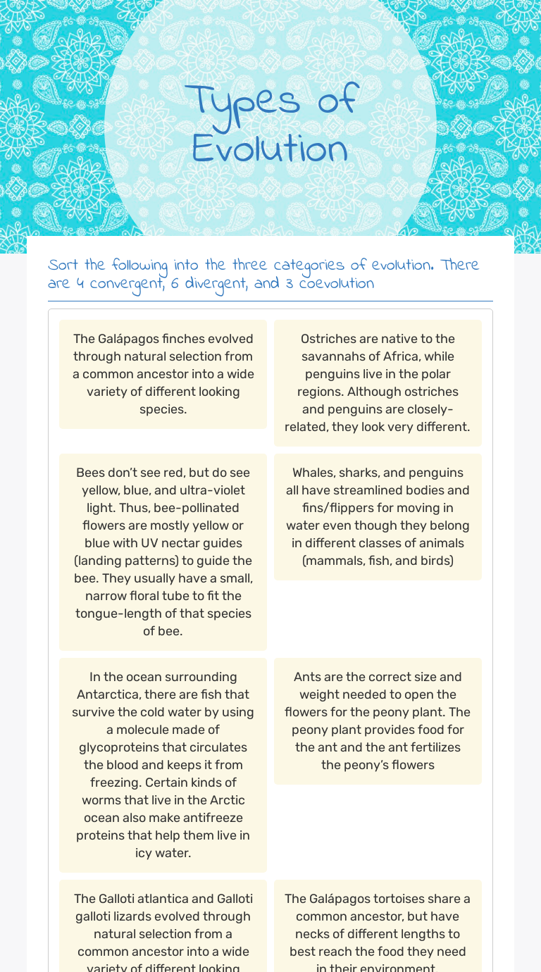 Types of evolution worksheet. Sheppard Software: Fun free online learning games and ... *Paint Cats* (paint 7 cats and learn different types) *Paint Dogs* (paint 12 dogs and learn different types) Elementary School - early Middle School *Animal Kid's Corner* (upper row for older kids, lower row for younger.) *Preschool Animals* (movies and create activities) *Math Games * (many levels and topics, many kinds of games) Patterns of Evolution: Types of Evolution | SparkNotes Evolution over time can follow several different patterns. Factors such as environment and predation pressures can have different effects on the ways in which species exposed to them evolve. shows the three main types of evolution: divergent, convergent, and parallel evolution. Figure%: Types of evolution; a)divergent, b)convergent, and c)parallel. The Evolution of the Cell - University of Utah The endosymbiotic theory describes how a large host cell and ingested bacteria could easily become dependent on one another for survival, resulting in a permanent relationship. Over millions of years of evolution, mitochondria and chloroplasts have become more specialized and today they cannot live outside the cell. It's Just a Theory Teaching Tools | Resources for Teachers from Scholastic Book List. Favorite Snow and Snowmen Stories to Celebrate the Joys of Winter. Grades PreK - 4