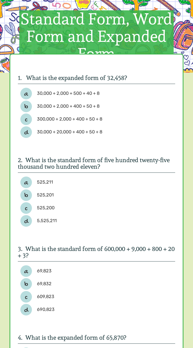 word form to standard form worksheets - TeachersPayTeachers Standard Form To Word Form, Expanded Form Worksheets, Place Value Preassessment by Printables and Worksheets 4.9 (28) $3.50 Zip These are no-prep worksheets containing practice sheets to help your kids understand the standard, word and expanded form of numbers. Simply pick and print the suitable type for your class, and you're ready to go!