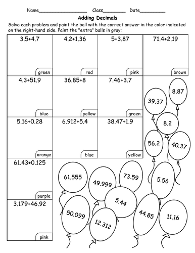Adding and subtracting decimals coloring worksheet. adding and subtracting decimals coloring - TeachersPayTeachers These are fun Spring coloring worksheets on adding and subtracting decimals. It's is a mystery picture activity that's great for quick assessment, practice, or homework. To use, your students must first answer the problems. Next, they should match their answers to the colors by choosing the letter from a list. Adding And Subtracting Decimals Coloring Sheet Teaching ... These are fun Spring coloring worksheets on adding and subtracting decimals. It's is a mystery picture activity that's great for quick assessment, practice, or homework. To use, your students must first answer the problems. Next, they should match their answers to the colors by choosing the letter from a list. Decimal Computations – Coloring Squared Practice computations with decimals. Practice addition, subtraction, multiplication, and division with these fun coloring pages. Complete the decimal computation problem in each square, use the key at the bottom of the page, and color the squares based on the answer. A fun pixel art picture is revealed when you finish coloring the squares. Enjoy!