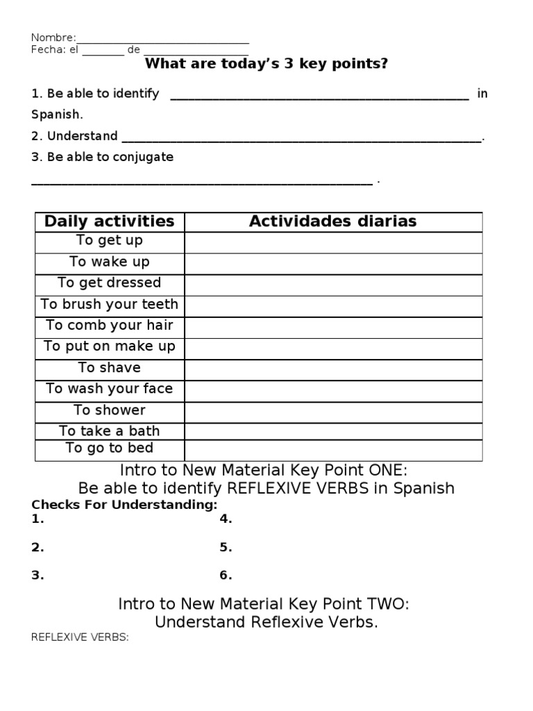 Spanish Reflexive Verbs Worksheets and Powerpoints ... Spanish reflexive verbs worksheets and powerpoints - lesson plans, tests, quizzes, interactive activities and more. Reflexive verbs practice worksheet - Liveworksheets.com Language: Spanish School subject: Español como Lengua Extranjera (ELE) Grade/level: High School Age: 14-18. Main content: Reflexive Verbs Spanish Reflexive Verbs Worksheets - Pinterest Spanish Reflexive Verbs Worksheets Spanish Conjugation Practice, Verb Practice, Spanish Practice, Learning Spanish. Celia. 26 followers ...