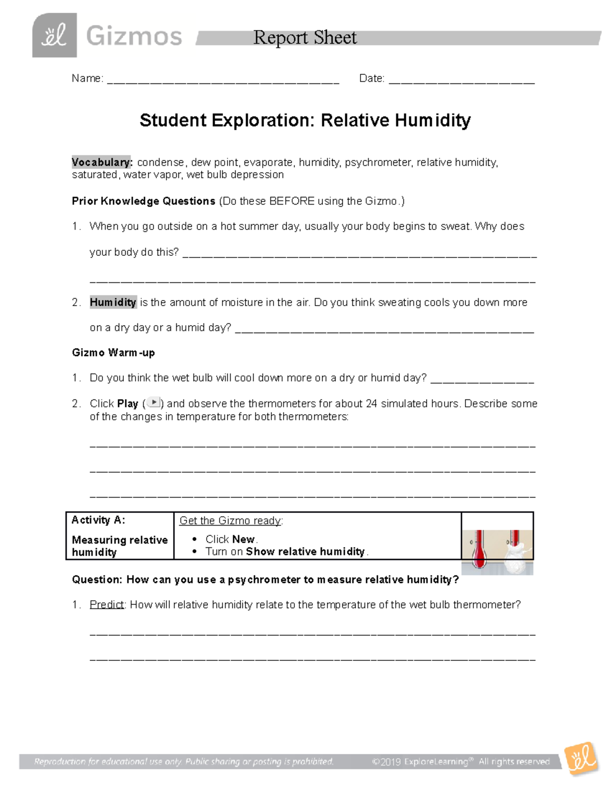 Dew-Point___Relative_Humidity_ESRT_12_Worksheet1588755791.pdf Questions 3 and 4 refer to the following: The weather instrument shown below can be used to determine relative humidity and dewpoint. 3) Based on the temperatures shown on the given weather instrument, what is the relative humidity? A) 33% B) 2% C) 19% D) 40% 2 End of preview. Want to read all 2 pages? Upload your study docs or become a Quiz & Worksheet - Relative Humidity | Study.com Relative humidity Specific humidity Meteorology Saturation Next Worksheet Print Worksheet 1. Which term best explains how close the air is to saturation? Relative humidity Specific... Answers to the Relative Humidity Gizmos Lab - Name - StuDocu The amount of water vapor in the air compared to the maximum amount air can hold is known as relative humidity. In the Relative Humidity Gizmo, you will use a psychrometer to determine relative humidity. A psychrometer has two thermometers. The dry bulb thermometer measures air temperature. The second thermometer has a wet bulb.