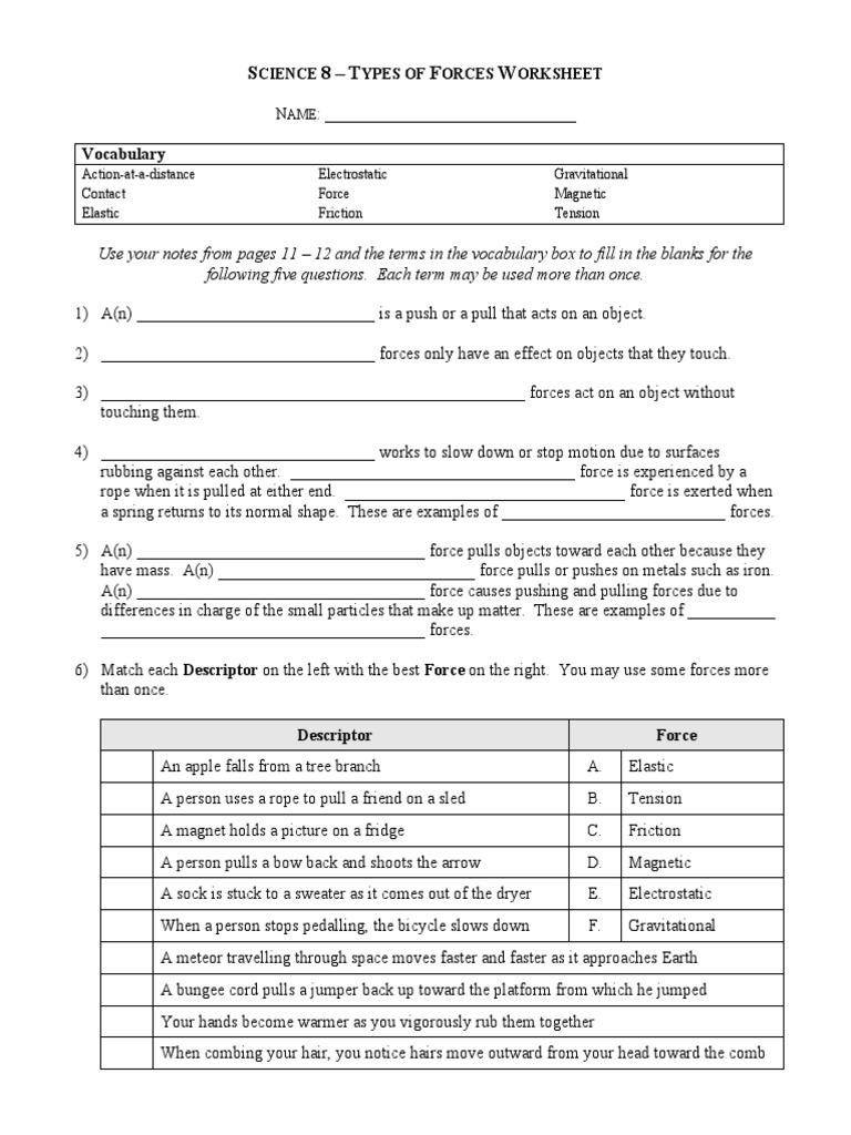 Science 8 types of forces worksheet answers. Forces worksheets and online exercises Forces worksheets and online activities. Free interactive exercises to ... Language: English Subject: Science ... Interactive worksheet Types of forces. Types of Forces Worksheet SCIENCE 8 – TYPES OF FORCES WORKSHEET. NAME: Vocabulary. Action-at-a-distance. Electrostatic. Gravitational. Contact. Force. Magnetic. Elastic. Friction. CBSE Worksheet for chapter-1 Force class 8 With Solutions Force, Effects of force, Definition of force · Balanced and unbalanced forces, Resultant force · Types of force – Contact force and Non – Contact force, Mass and ... What Type of Force? - Live Worksheets School subject: Science Grade/level: 5 - 8. Age: 9-13. Main content: Types of Forces Other contents: Add to my workbooks (53) Download file pdf