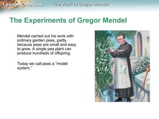 CB April 29 HOMEWORK_BIOLOGY_UNIT_7_11-1_The_Work_of_Gregor_Mendel.pdf Name Class Date 11.1 The Work of Gregor Mendel Lesson Objectives Describe Mendel's studies and conclusions about inheritance. Describe what happens during segregation. Lesson Summary The Experiments of Gregor Mendel The delivery of characteristics from parents to offspring is heredity. The scientific study of heredity is genetics.Gregor Mendel founded modern genetics with his experiments on ...