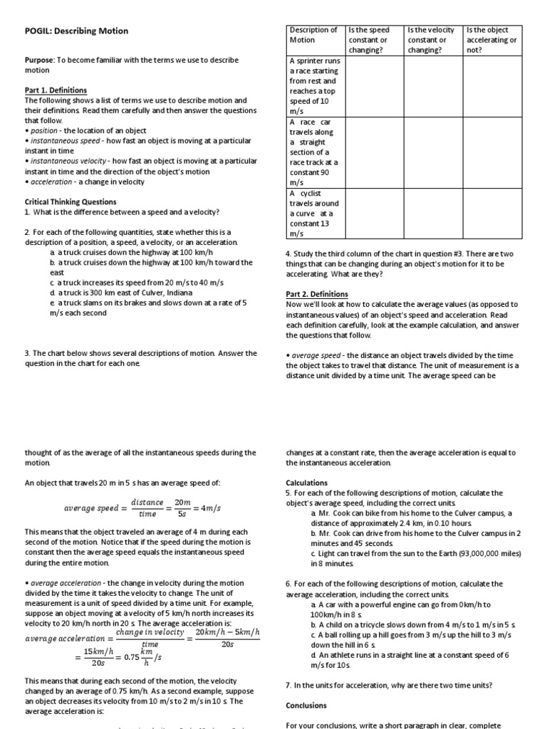 Describing motion worksheet answers. › createJoin LiveJournal Password requirements: 6 to 30 characters long; ASCII characters only (characters found on a standard US keyboard); must contain at least 4 different symbols; kejf.suetterlin-buero.de › velocitytime-graphvelocitytime graph worksheet with answers pdf A worksheet that requires the pupils to construct their own graphs of motion and answers questions about them. Velocity time graph worksheet and answers. Kinematics Motion Graph Matching Card Game. Introduction to Position-Time Graphs Position-Time Graphs tell you where an object is located over a period of time. › class › estaticsPhysics Tutorial: Charge Interactions - Physics Classroom Answers: A, B and C. Y is observed to attract a negatively charged object (balloon X). So Y could be either positively charged or neutral. Y attracts Z. If Y were neutral (and we don't know for sure that it is), then Z would attract Y if it were either + or -. So A and B are two possible answers. But Y could be positively charged. › class › estaticsPhysics Tutorial: Charging by Conduction - Physics Classroom Use your understanding of charge to answer the following questions. When finished, click the button to view the answers. 1. A neutral metal sphere is touched by a negatively charged metal rod. As a result, the sphere will be ____ and the metal rod will be ____. Select the two answers in their respective order. a. positively charged. b ...