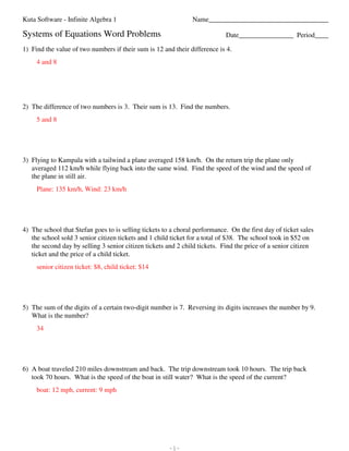 PDF Systems of Equations Word Problems - Kuta Software Kuta Software - Infinite Algebra 2 Name_____ Systems of Equations Word Problems Date_____ Period____ 1) The school that Lisa goes to is selling tickets to the annual talent show. On the first day of ticket sales the school sold 4 senior citizen tickets and 5 student tickets for a total of $102.