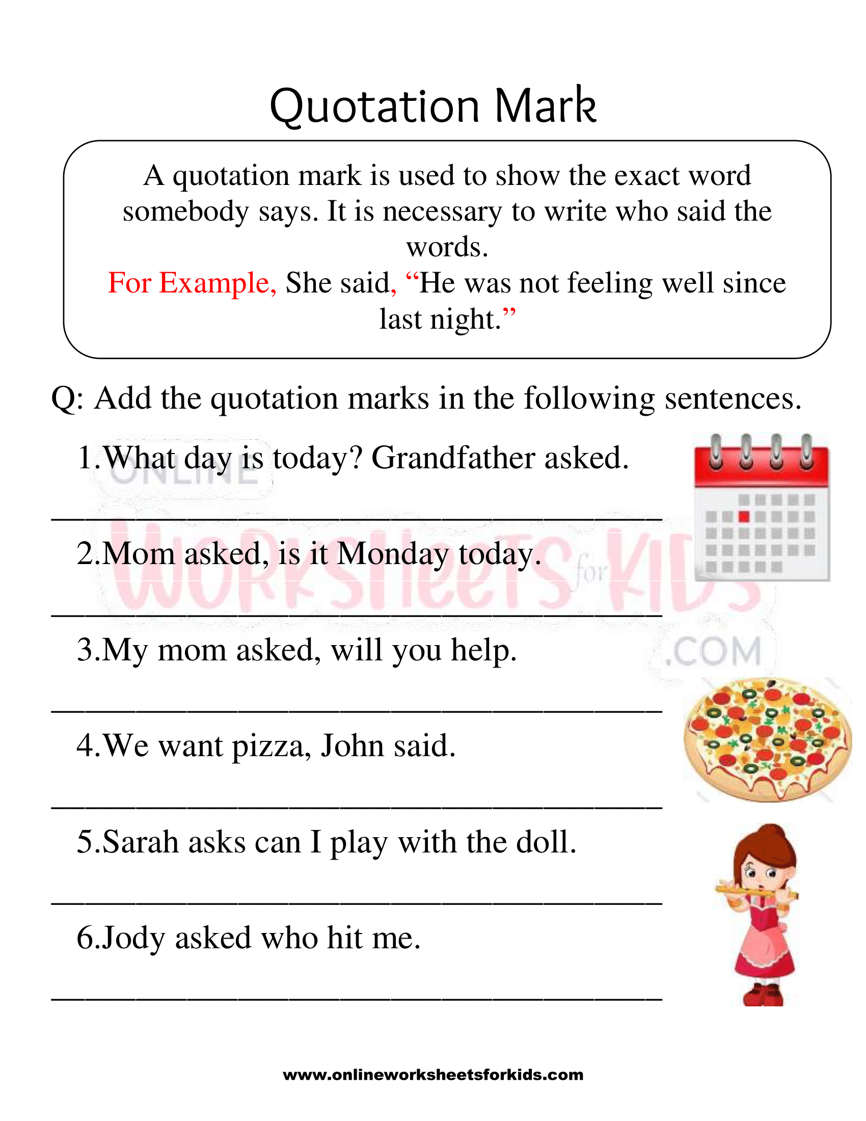 Quotation marks worksheet 1 answers. Fair Project Ideas, Answers, & Tools Free Topic Selection Wizard, science fair project ideas, step by step how to do a science fair project, Ask an Expert discussion board, and science fair tips for success. corner.bigblueinteractive.com › indexThe Corner Forum - New York Giants Fans Discussion Board ... Page: 1 Part of the USA Today Sports Media Group BigBlueInteractive SM provides news, analysis, and discussion on the New York Football Giants. This site is owned and operated by Big Blue Interactive, LLC. › Languageart › GrammarInAction501 GRAMMAR AND WRITING QUESTIONS Inside a quotation mark when the quote is an excla-mation The woman yelled,“Hurry up! I cannot be late for the meeting!” Quotation Marks When directly quoting dialogue, not when para-phrasing Hamlet says, “To be, or not to be. That is the question.” For titles of chapters, articles, short stories, poems, successessays.comSuccess Essays - Assisting students with assignments online Each paper writer passes a series of grammar and vocabulary tests before joining our team.