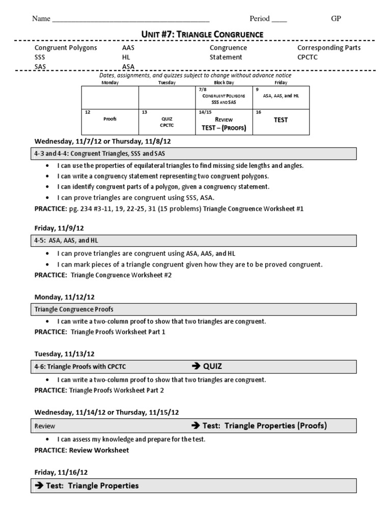 PDF U NIITT N ##77:: RRIIAANGLLEE G COONGGRUUEENCCEE - Denton ISD I can prove triangles are congruent using SSS, ASA. PRACTICE: pg. 234 #3-11, 19, 22-25, 31 (15 problems) Triangle Congruence Worksheet #1 Friday, 11/9/12 4-5: ASA, AAS, and HL ASA, AAS, and HLI can prove triangles are congruent using I can mark pieces of a triangle congruent given how they are to be proved congruent.