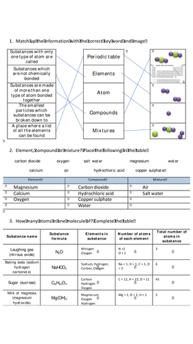 Elements compounds & mixtures worksheet. Elements, Compounds & Mixtures Worksheet Flashcards | Quizlet Elements, Compounds & Mixtures Worksheet Term 1 / 2 Elements, Compounds & Mixtures Worksheet Part 1: Read the following information on elements, compounds and mixtures. Fill in the blanks where necessary. Elements: • A pure substance containing only one kind of __atom____. • An element is always uniform all the way through (homogeneous). Ejercicio interactivo de Elements, Compounds, and Mixtures ID: 3289459 Idioma: inglés Asignatura: Science Curso/nivel: 8 Edad: 11-15 Tema principal: Chemistry Otros contenidos: Añadir a mis cuadernos (0) Descargar archivo pdf Insertar en mi web o blog Molecules Compounds Worksheet.doc - Elements, Compounds & Mixtures ... E___2. Mixture of two elements - two types of uncombined atoms present. B___3. Pure compound - only one type of compound present. A___4. Mixture of two compounds - two types of compounds present. D___5. Mixture of a compound and an element. Part 4: Column A lists a substance. Elements, Compounds & Mixtures Worksheet - academia.edu Elements, Compounds & Mixtures Worksheet LEAH AGCAOILI Part 2: Classify each of the following as elements (E), compounds (C) or Mixtures (M). Write the letter X if it is none of these. Download Free PDF Report for the National … Biodiesel production technology 2004 • Clyve Pahugot Download Free PDF View PDF Chandra Pasaribu Download Free PDF