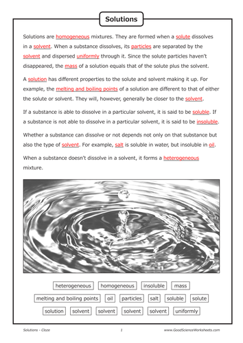 Solutions and Solubility [Cloze Worksheet] - TES pdf, 669.78 KB Simple fill-in-the-blank cloze activity covering the topic "Solutions" (Year 7 Australian curriculum or equivalent). Clearly laid out, reinforcing key words and concepts. Includes a teacher answer version. A full preview of this resource is available at: