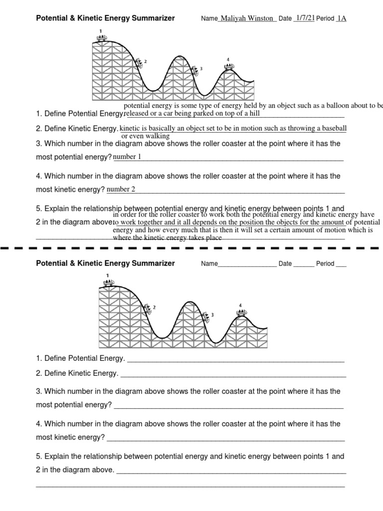 Kinetic And Potential Energy Worksheet Answers You Serve A Volleyball This Kinetic energy worksheet was designed to help students comprehend the concept of conserving energy. It offers a variety of ways for students to practice and master the concepts. This worksheet is a great tool for tutors, teachers, parents, and students in grades 6-9. Kinetic and potential energy - grade 6 - download now - eTutorWorld 1) Gravitational potential energy -. An object suspended at height has gravitational potential energy. For example, a ball or a skier at a height. A raised hammer possesses gravitational potential energy that holds the ability to displace a nail (work). The higher and bigger in mass, the greater would be their potential energy! Energy in a Roller Coaster Ride | PBS LearningMedia This interactive roller coaster ride produced by WGBH illustrates the relationship between potential and kinetic energy. As the coaster cars go up and down the hills and around the loop of the track, a pie chart shows how the relative transformation back and forth between gravitational potential energy and kinetic energy.