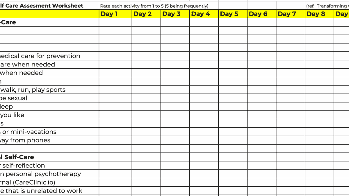 Self-Care Assessment Worksheet | PsychPoint This worksheet serves as a means to assess a client's understanding of what self-care means, and their motivation to incorporate self-care into their lives. The Self-Care Assessment worksheet can serve as a visual for how a client prioritizes themselves in their lives. It also helps them identify the self-care practices that work best for them.