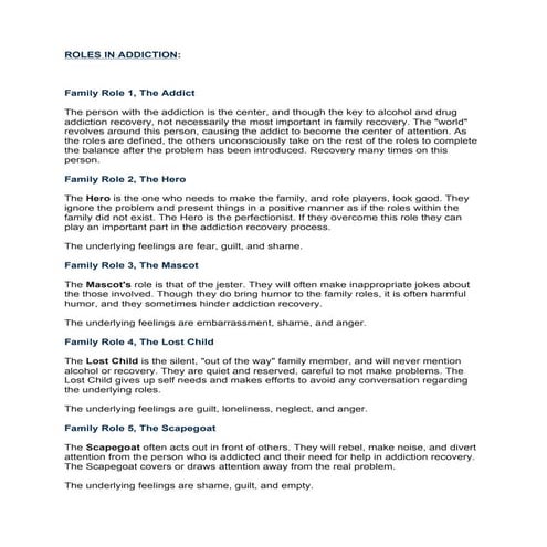 On the Road to Recovery: Family Roles in Addiction - Alvernia Online Common Issues and Roles. Family members can experience common issues and fill similar roles in an effort to cope with addiction. Two of the most common problems are codependency and enabling. Codependency occurs when a family member is controlled by the addict's behavior. The spouse or other family members often feel compelled to take care of ... How Addiction Impacts the Family: 6 Family Roles in a Dysfunctional or ... Common Roles in Addicted Families The Addict Addicts function and fulfill their responsibilities to varying degrees. For most, addiction progresses as the quantity and frequency of their drug...