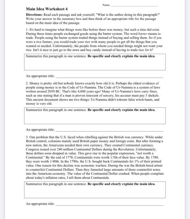 Main Idea Worksheet 4 | Reading Activity - Ereading Worksheets Main Idea Worksheet 4 Here is one more double-sided main idea worksheet. Students read seven passages about money and systems of exchange. They summarize each paragraph, state the main idea, and think of an appropriate title for the passage. Suggested reading level for this text: Grade 5-9 CONTROLS Edit Print Answers Online U.S. Bureau of Labor Statistics WebThe Bureau of Labor Statistics is the principal fact-finding agency for the Federal Government in the broad field of labor economics and statistics.
