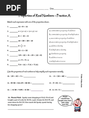 › math › integersProperties of Real Numbers Worksheets - Easy Teacher Worksheets The worksheets also go over certain properties of real numbers, such as the commutative property of addition, relate to actual equations. Your students will use these worksheets to review identifying the property associated with a given expression. Note: students should already be familiar with the list of the properties of real numbers.