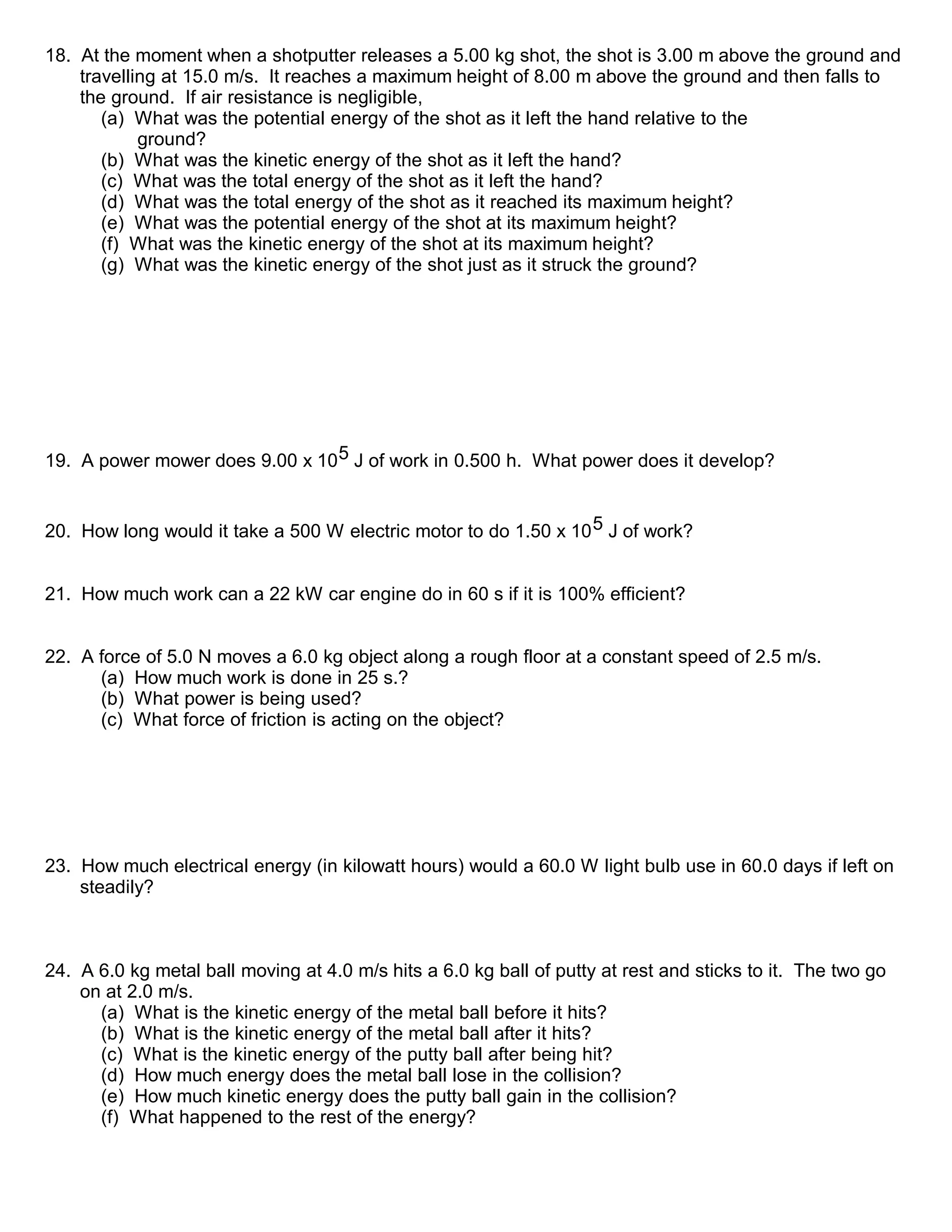 DOC Work, Power and Energy Worksheet - New Providence School District Work, Power and Energy Worksheet Conceptual Physics: Work and Power 1. Calculate the work done by a 47 N force pushing a pencil 0.26 m. 2. Calculate the work done by a 47 N force pushing a 0.025 kg pencil 0.25 m against a force of 23 N. 3. Calculate the work done by a 2.4 N force pushing a 400. g sandwich across a table 0.75 m wide. 4.